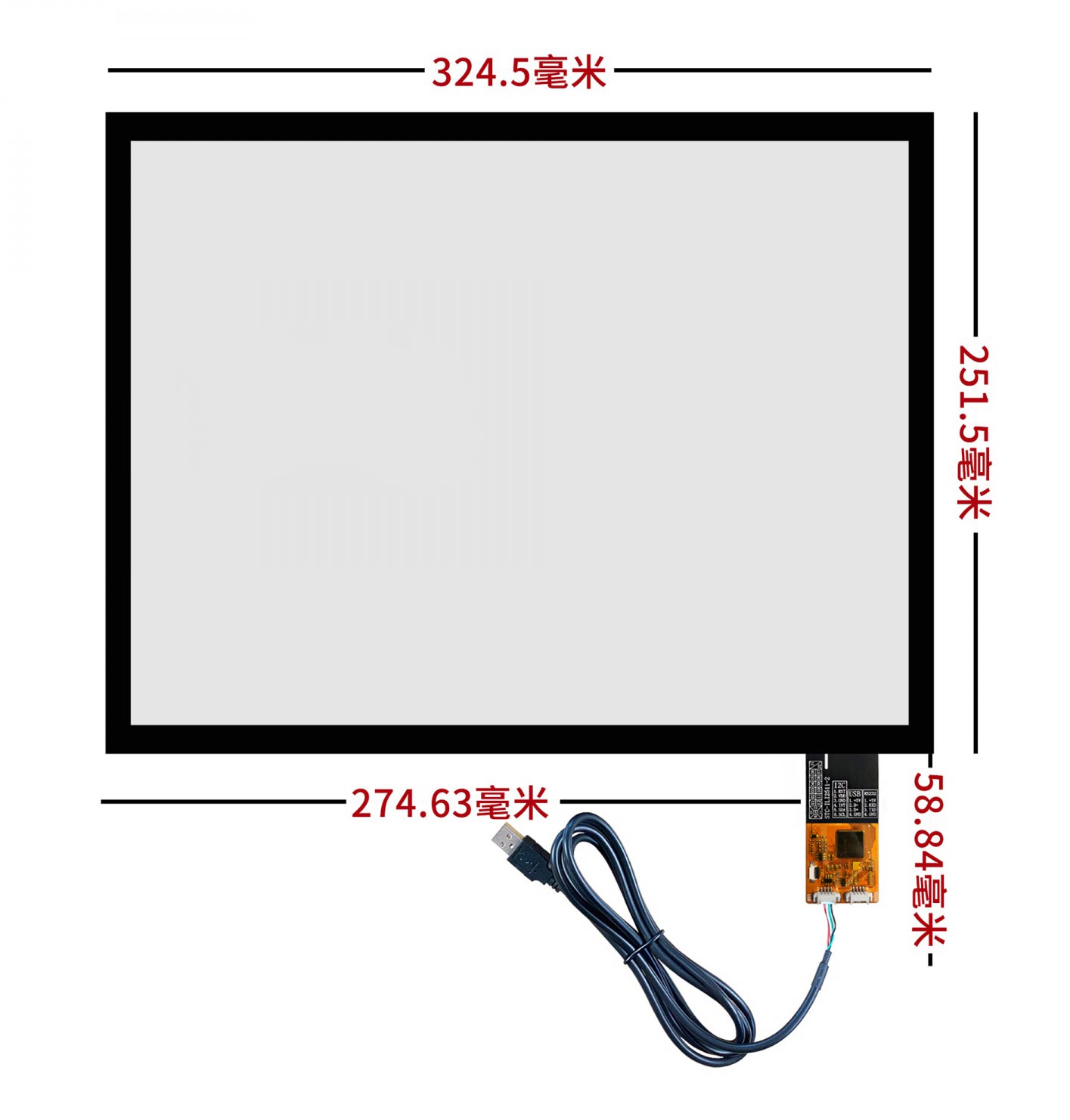15.0寸电容触摸屏规格 型号:15191 屏幕类型:平面 触摸IC:ILI2511 触点数量:10点 接口方式:IIC+USB 接口位置:右下