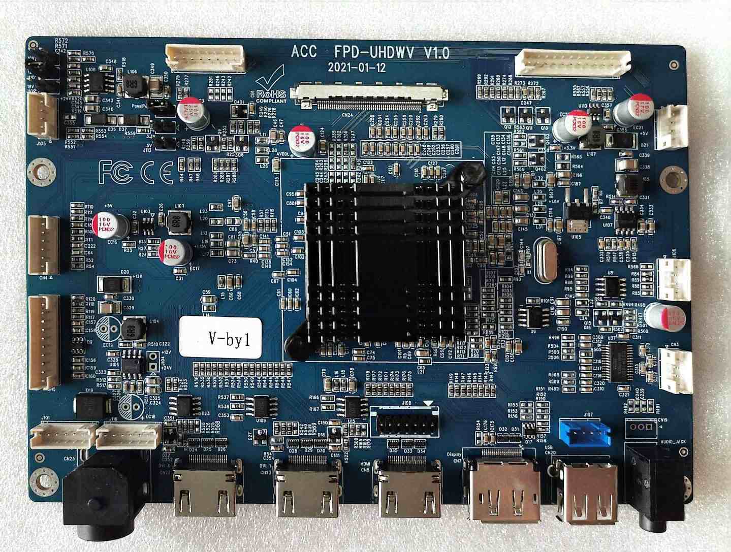 型 号: FPD-UHDWV V1.0 4K驱动板 支持尺寸: 6.5-82寸 输入电压: 24V单电源供电 芯片方案: MSTAR处理片 工作温度: -40到 65℃ 相对湿度20%到80% 存储温度: -40到 65℃ 相对湿度5%到85% 板卡尺寸: 164×115mm 支持最大分辨率:4096×2160 输出接口: YBY1输出 输入信号接口: 3路HDMI输入,1路DP输入