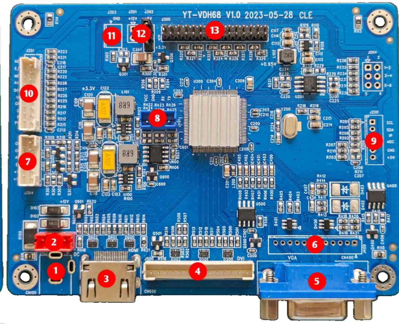 型 号: YT-VDH68低温款 支持尺寸: 6.5-82寸 输入电压: 12V 芯片方案: MTK 信号处理芯片 板卡尺寸: 109.97x82.52mm 支持最大分辨率:1920x1200 输出接口: 单/双通道LVDS 输入信号接口: 1 路 VGA、1 路 DVI 和一路 HDMI, 支持 LVDS 输出接口